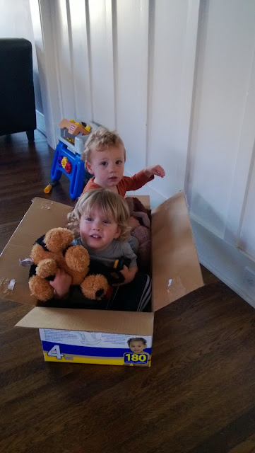 Aidan and Parker's favorite activities? Playing with/in a box, being read to, and chase - not pictured because it's hard to get a picture of little boys running back and forth. :-)